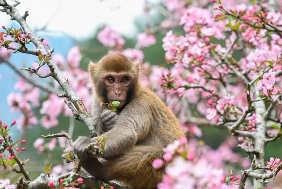 成群猕猴穿梭于花枝间或坐于枝桠轻嗅花香