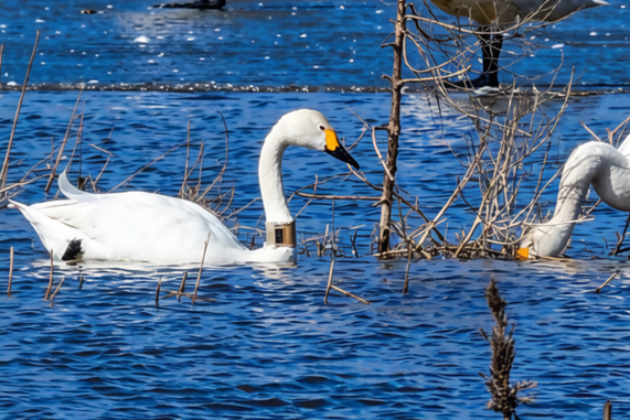 好消息不久传来——包头市土右旗摄影爱好者高富元3月17日15时拍到两只小天鹅同框的两张照片,其中一只疑似“古田乐”。经闽江河口湿地团队细致比对,确认脖子上戴有定位器的小天鹅,正是“古田乐”。这两张照片,不仅定格了“古田乐”安然无恙的模样,更让这场跨地域的守护有了暖心成果。