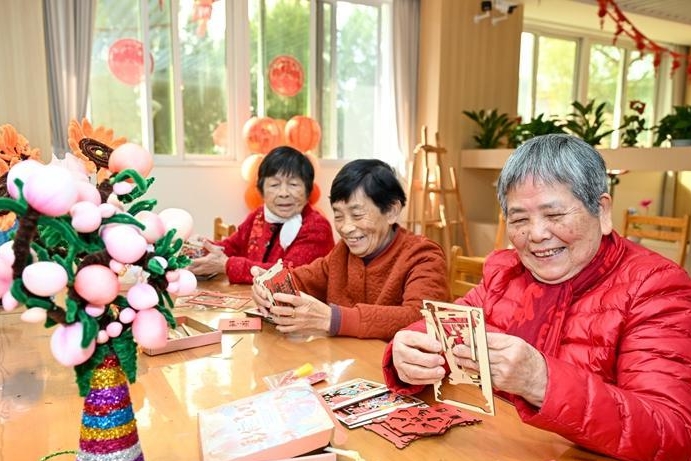 福州市社会福利院里,老人们在一起学做手工。记者 池远 摄