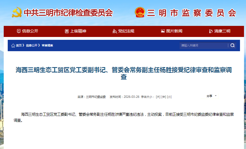 海西三明生态工贸区党工委副书记、管委会常务副主任杨胜涉嫌严重违纪违法,主动投案,目前正接受三明市纪委监委纪律审查和监察调查。