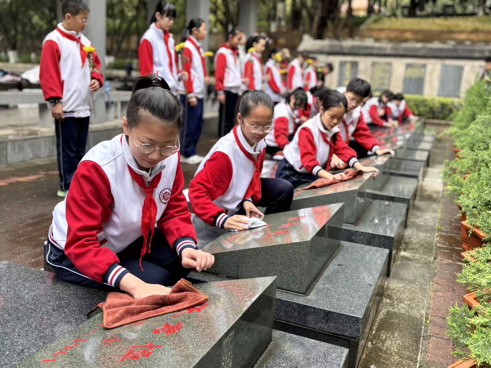 启动仪式后,师生代表在陵园工作人员引导下开展系列纪念活动。在纪念广场,学生们重温入队誓词,将亲手折好的800只纸和平鸽系挂于指定位置。在烈士后代康智敏的讲述中,学生们认真聆听英烈故事,感悟信仰力量。太平小学40名学生代表书写寄语,将卡片张贴在寄语栏上。50名学生代表细心擦拭烈士墓碑,以躬身实践致敬英烈忠魂。