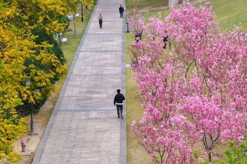 乌龙江公园沙滩园区内,近百株粉色晚樱也竞相开放,花期将延续至4月初。(莫思予 石磊磊 刘珺/文)