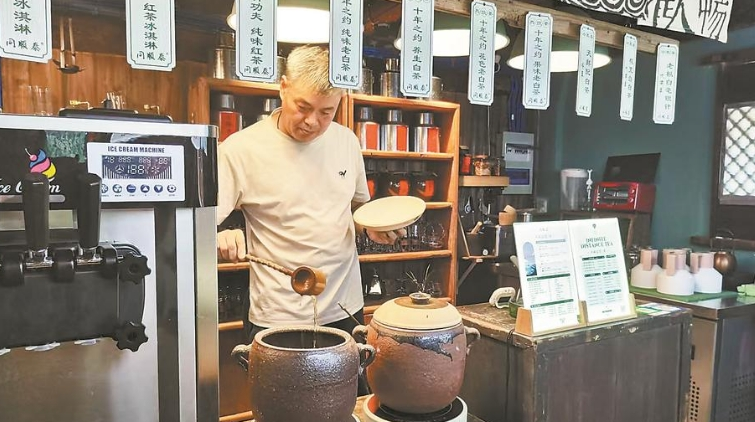 柜台里,白茶冰淇淋、冷萃白茶、茶咖啡等新茶饮吸引着年轻人的目光。“老房子不能只是摆着看,要能让人用得上、能玩出新花样。”“同顺泰”茶馆负责人黄红心说。