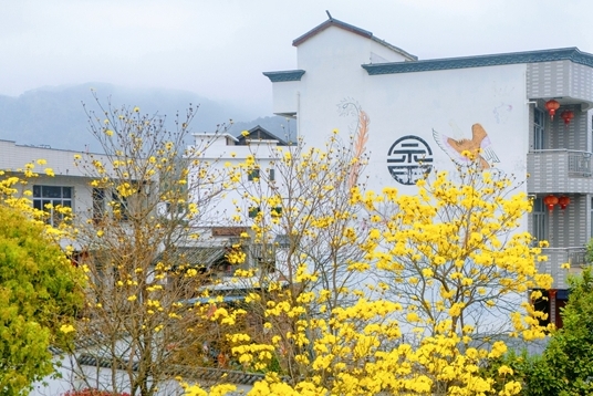 眼下,连江县东湖镇天竹村的黄花风铃木迎来盛花期,成簇的黄花形似风铃,挂在树梢随风摇曳。