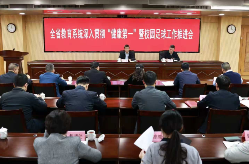 会议强调,要深入学习领会习近平总书记关于“健康第一”的重要指示批示精神,充分把握党中央和省委、省政府关于校园足球工作的重要要求,提高政治站位,进一步提升落实“健康第一”教育理念和校园足球工作的思想认识。要以健康学校建设为总抓手,紧扣促进学生身心健康、全面发展的核心目标,全面落实“健康第一”和校园足球各项重点任务。一要全面实施学生体质强健计划。各地各校要优化课时统筹,充分保障体育活动时间;深化体育教学改革,开展差异化教学;完善校园体育竞赛体系,打造“一校一品”“一校多品”校园体育文化;强化学校体育师资保障,按编制配齐体育教师;实施大学生体质专项提升行动,各高校“一校一案”制定专项行动方案。二要全面推进校园足球高质量发展。要夯实校园足球发展基础,落实足球课时、场地、师资等要求,全面加强足球特色学校建设。广泛开展“班超”“校超”联赛,掀起校园足球运动热潮。推动体教融合纵深发展,加强青训与校园足球衔接,探索建立小学、初中、高中、大学相互衔接的足球人才贯通培养体系,构建足球人才成长“立交桥”。三要持续深化儿童青少年近视防控。坚持抓早抓小,把幼儿园作为近视防控的“第一道关口”,加强学龄前儿童“远视储备”保护。中小学校、幼儿园要全面落实“六个一”近视防控要求,进一步改善学校教学设施和条件,优化视觉环境,聚焦科学用眼习惯等核心内容,开展近视防控科普宣传。加强监测指导,严格落实视力监测制度。四要系统加强学生心理健康工作。充分发挥省学校心理健康教育指导委员会作用,健全监测预警和干预处置体系;以家校社协同育人“教联体”建设为抓手,构建全方位社会支持体系;推动各校配齐建强专职心理健康教师,提升心理健康教师专业能力。持续办好全省“5·25”学校心理健康宣传教育月活动,广泛普及心理健康知识。深入实施学校“温暖集体行动”,帮助学生在集体中感受到温暖和归属,促进学生身心健康、全面发展。