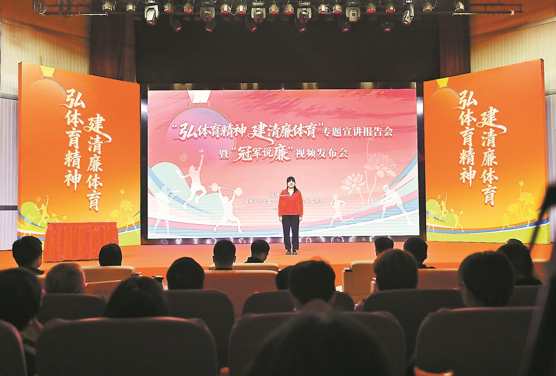 12月9日,福建省体育局会同驻局纪检监察组举办了“弘体育精神,建清廉体育”专题宣讲报告会暨“冠军说廉”视频发布会,彰显具有福建体育特色的廉洁文化建设成效,以“存正心、守正道、养正气”的理念赋能体育事业。