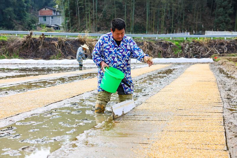 田间地头里,农户正忙着进行早制杂交水稻母本育秧播种作业,抢抓农时开展春耕生产。