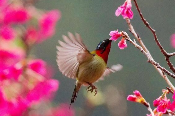 叉尾太阳鸟正在吸食山樱花的花蜜