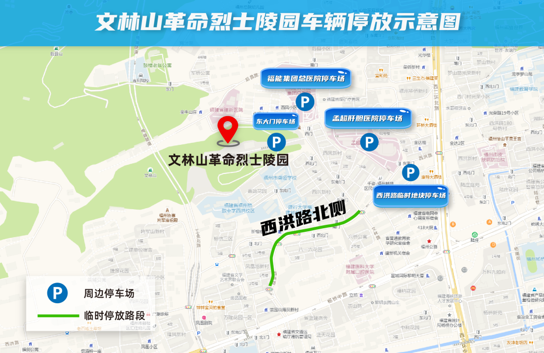 祭扫车辆可停放在陵园东大门停车场,以及周边的福能集团总医院停车场、孟超肝胆医院停车场、西洪路临时地块停车场。同时,西洪路(文林路口-凤凰池巷口)允许祭扫车辆在北侧单排停放。