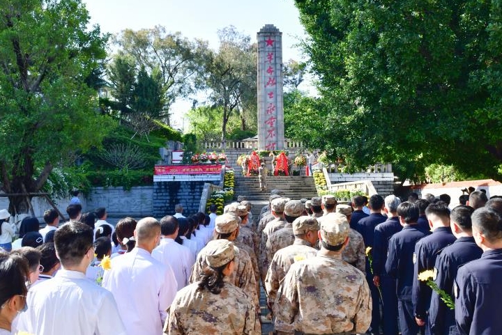 现场,全体人员在烈士纪念碑前肃立,聆听“先烈的故事”。随后,全场向烈士默哀、致敬,向革命先烈敬献花篮。