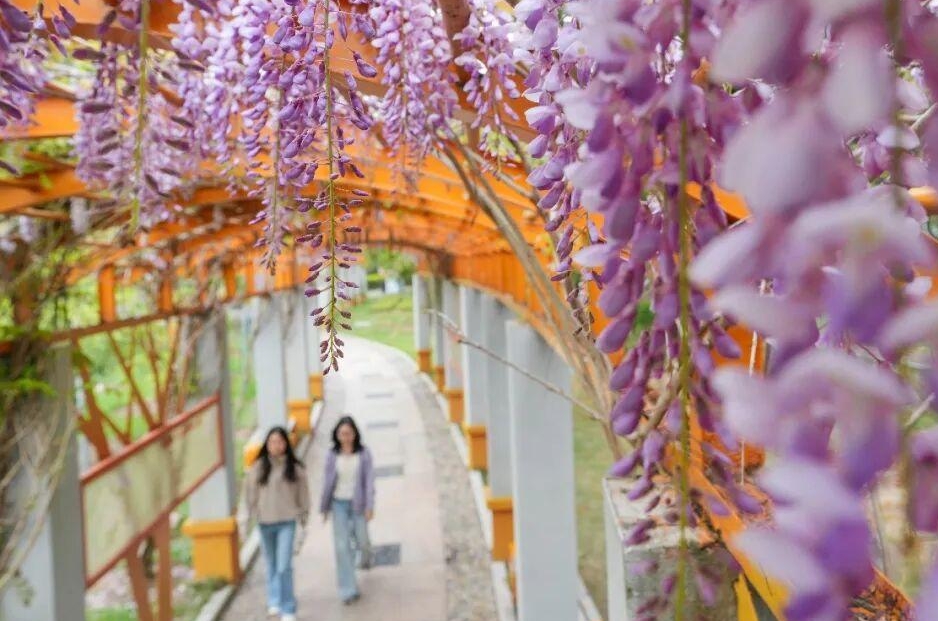 紫藤挂云木,花蔓宜阳春。福州每年的三月底四月初,是紫藤的最佳观赏期。在春日细雨的浸润下,闽江公园南园内,混凝土花廊与钢结构花廊串联而成的百米紫藤花廊织就出一条紫色花带,为福州春日增添一道浪漫的色彩。