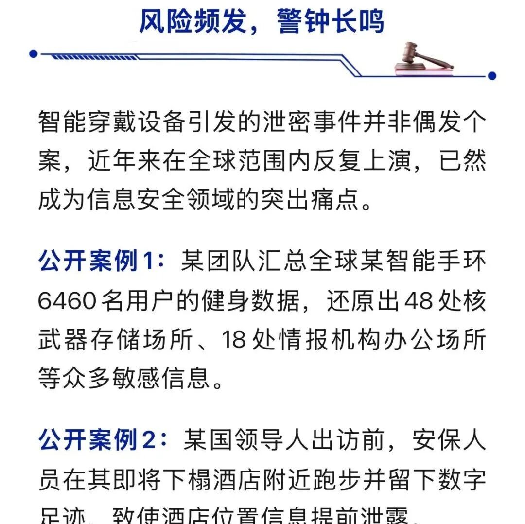 近日,某国发生一起因智能穿戴设备导致的军事机密泄露事件,引发全球关注。当时该国某重要军事装备正在执行任务,一名军官跑步时佩戴的智能运动手表持续记录并公开了高精度GPS数据,致使该军事装备实时位置等重要敏感信息泄露,给该国国防安全造成难以弥补的重大损失,也让智能穿戴设备的泄密风险再次走入人们的视线。