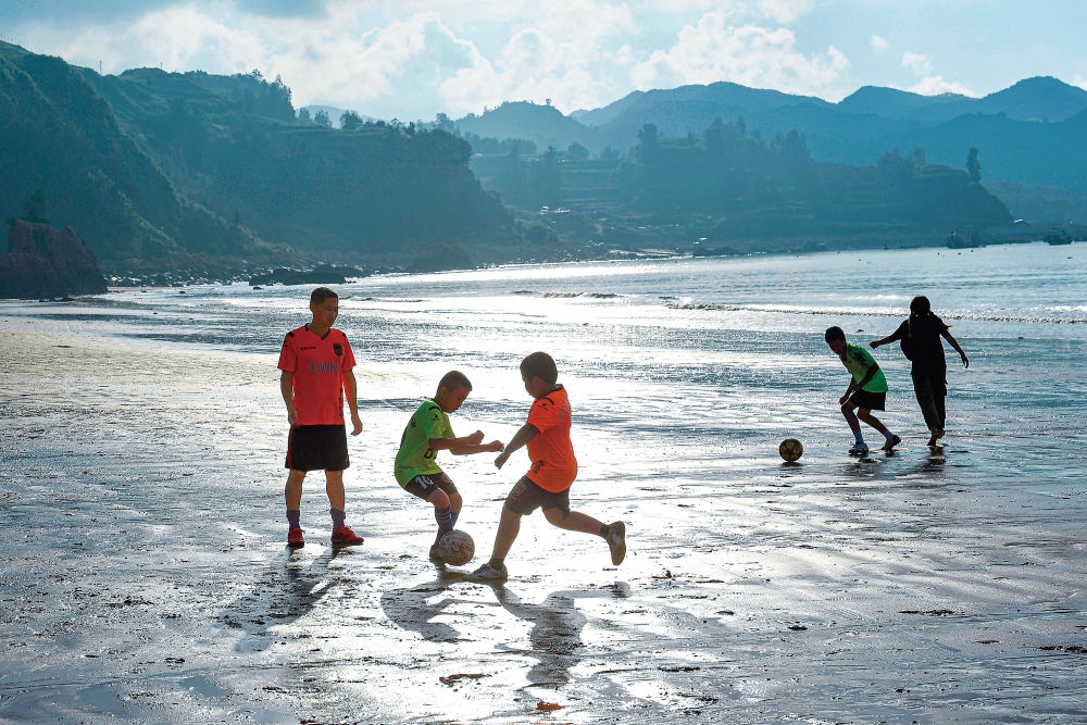 霞浦下浒镇两面临海,过去是闽东沿海抵御倭寇的要冲之一。在下浒,曾有一支由一群孩子和一个大人组成的“长风足球队”,球队晴天的主场是海边一片沙滩,雨天则是镇里明代古堡的一座寺庙。在沙滩上,用树枝画出场地、花100元买来塑料管拼成球门,海风、海浪做伴,一场酣畅淋漓的球赛就能开始。