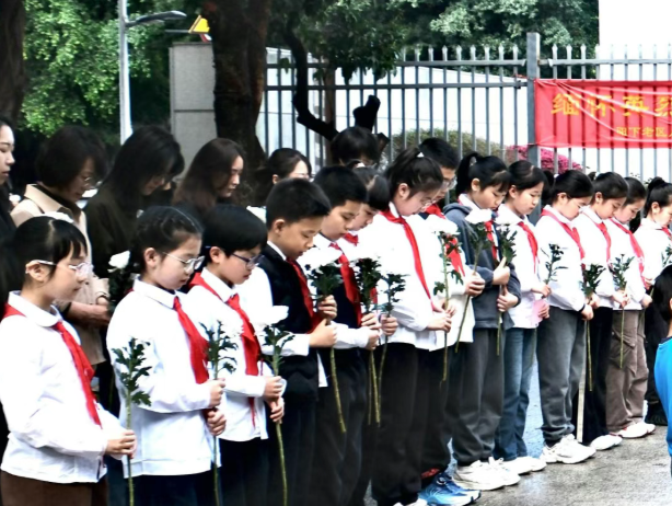 默哀寄哀思,鲜花敬英雄。全体师生肃立默哀,向在鸡角弄英勇就义的英烈,以及所有为家国牺牲的英雄烈士,致以最崇高的敬意。默哀结束后,少先队员们有序走向革命先烈纪念碑,亲手敬献鲜花,用最朴素的方式表达对英烈的追思与敬仰。