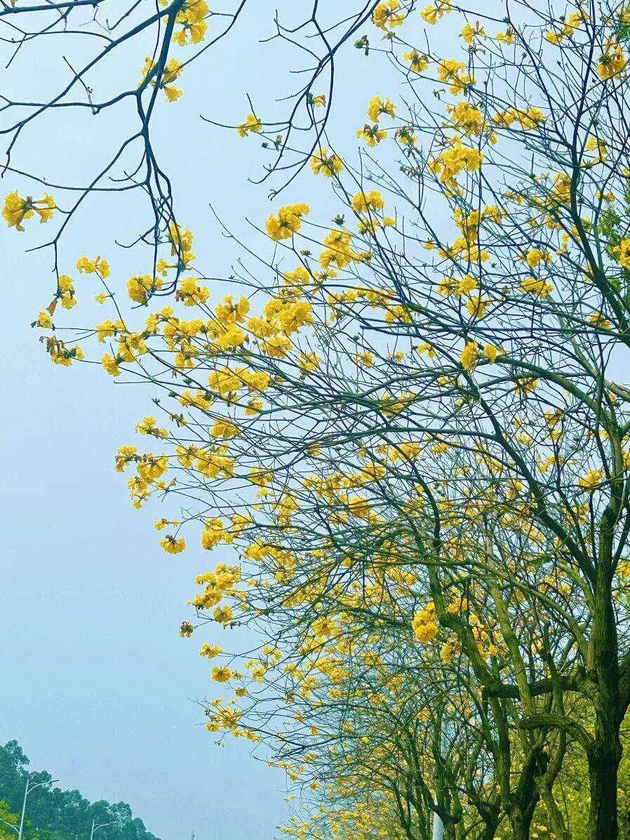 黄花风铃木又名黄金风铃木,是紫葳科风铃木属的落叶乔木,它最特别的地方在于先花后叶,每年3—4月在叶片尚未萌发之时,满树便会绽放出漏斗状的金黄色花朵,形似一串串小风铃,在微风中轻轻摇曳,因此得名“风铃木”。这种树适应性强,耐热耐旱,盛花期时满树繁花,远远望去如同一团团燃烧的金色火焰。