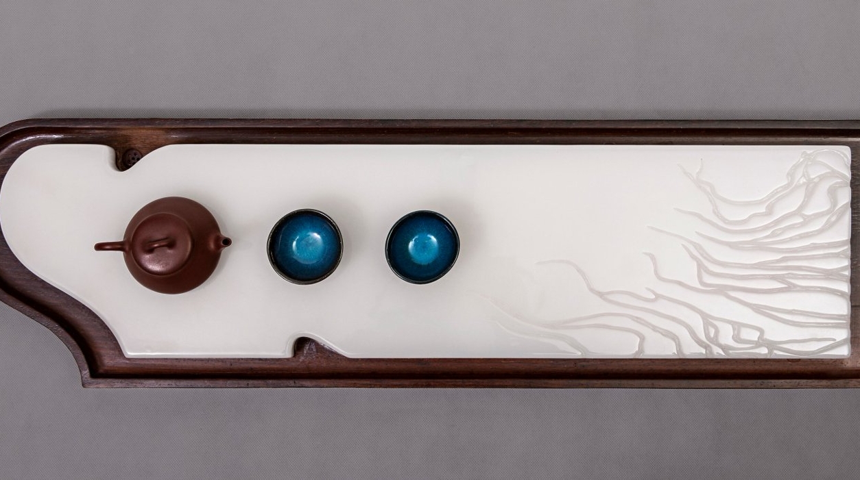 茶盘上承载器物的台面由玉石纯手工雕成,琴头、琴腰处设计两道凹折。玉质地温润,颜色洁净,日光一照,表面便泛起柔和的光晕,像是从石头内部透出来的,温温吞吞,不刺眼。