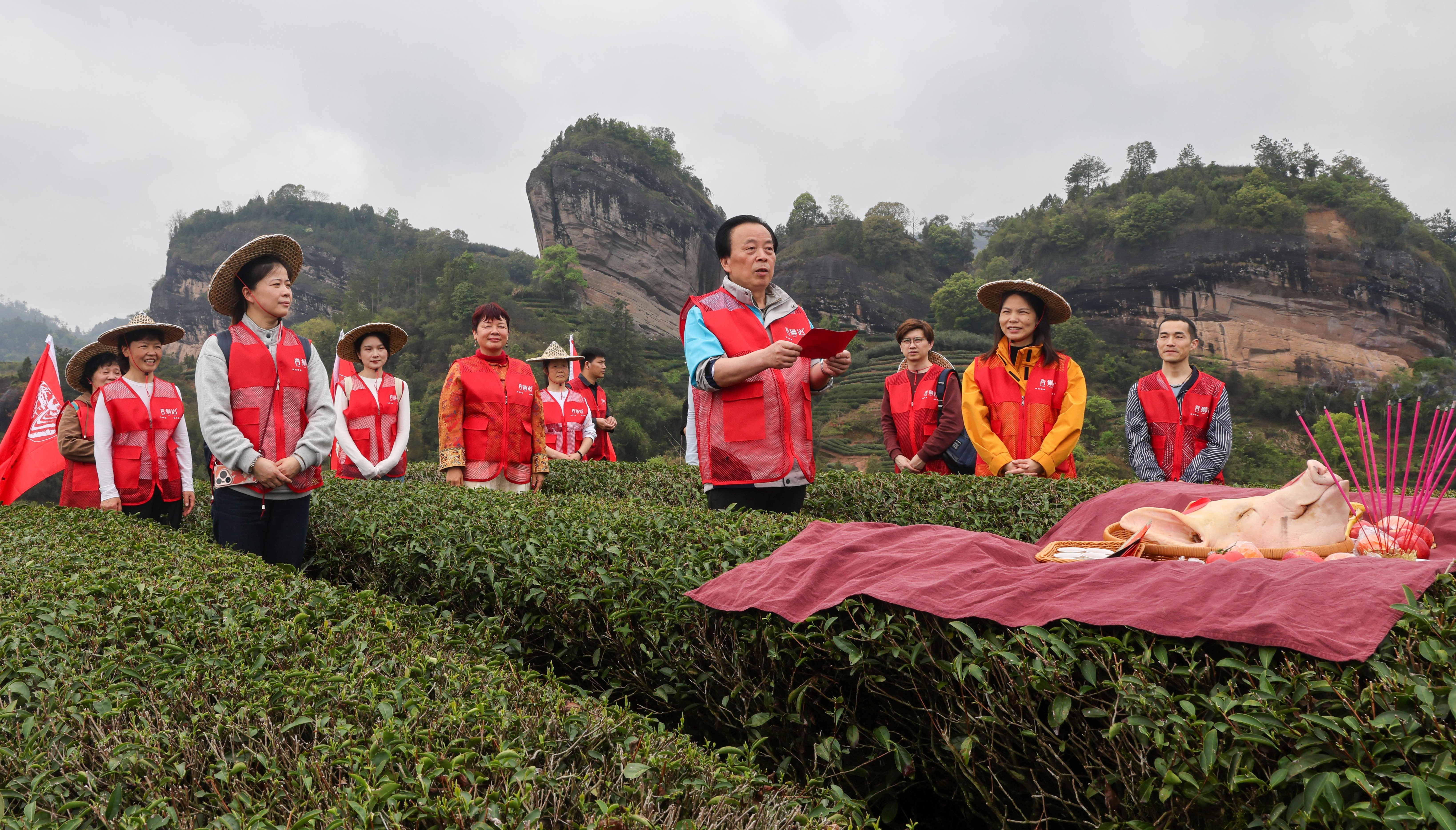 3月29日,来自湖北武汉的茶人在武夷山原生态茶场体验喊山祭茶。 邱汝泉 摄