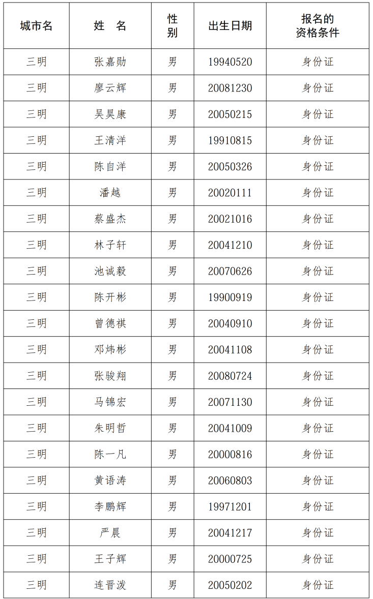 东南网4月4日讯 “闽超”参赛球员名单来了,本次比赛三明将派出49人参赛。 福建省体育局关于 2026年福建省城市足球联赛 各城市参赛球员名单公示的公告 各设区市体育局、平潭综合实验区旅游与文化体育局: 根据《2026年福建省城市足球联赛竞赛规程》相关规定,经各城市参赛队伍报名,资格审查小组审核,现将2026年福建省城市足球联赛各城市参赛球员名单予以公示。公示时间为2026年4月3日至4月9日,公示期间,如对参赛球员有不同意见,可通过电话、电子邮件等形式向省体育局反映情况。反映情况要客观真实,以单位名义反映情况的材料需加盖单位公章,以个人名义反映情况的材料署本人真实姓名并提供联系方式。 联系电话:0591-88017869 电子邮件:fujian.fa@thecfa.cn 福建省体育局 2026年4月2日 一起来看看 有你认识的人吗 三明市参赛球员名单