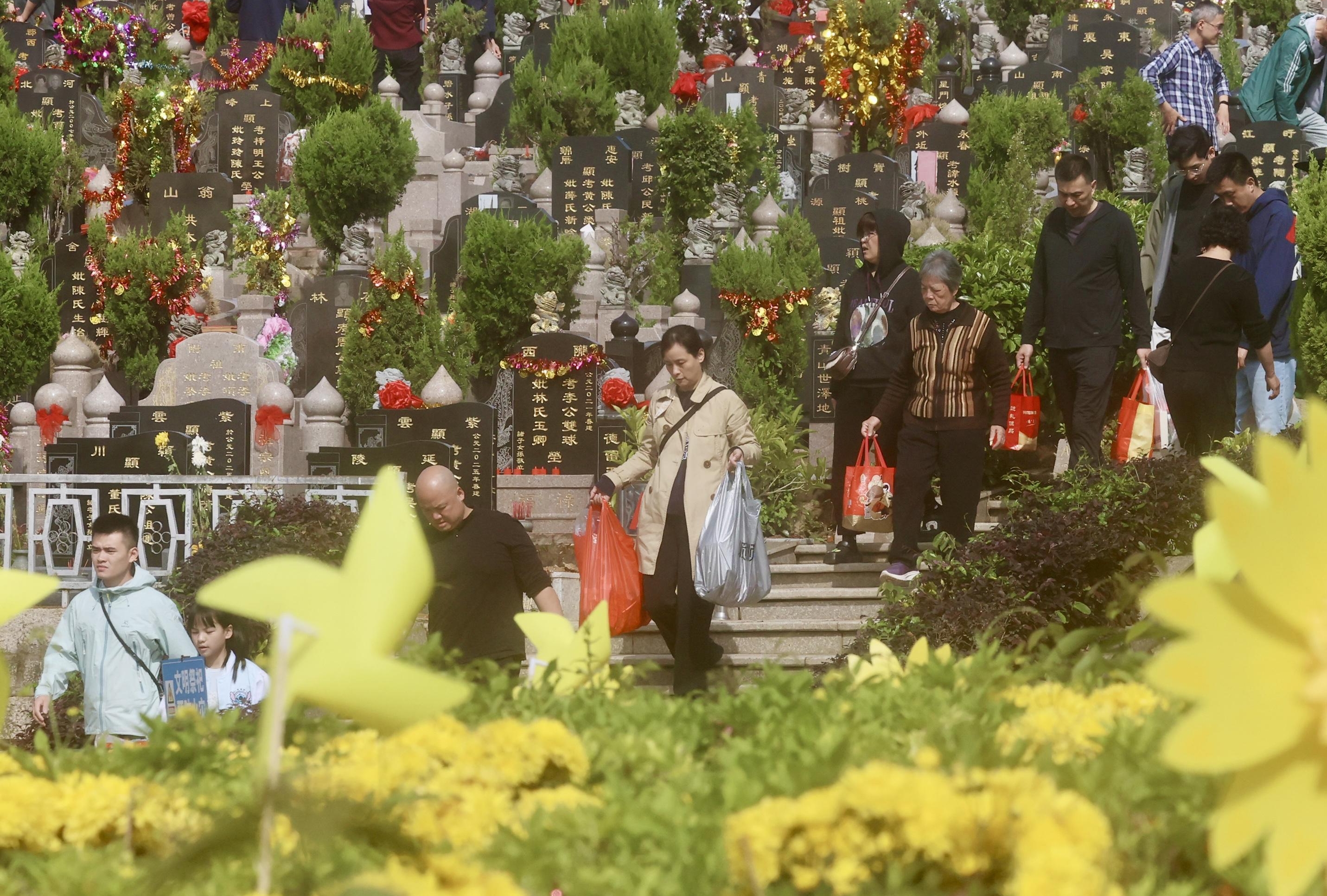 清明假期首日,天朗气清。在泉州市区宏福园,市民携家带口,带上鲜花祭奠先人,文明祭扫蔚然成风。(泉州晚报社融媒体记者陈小阳 郑银杰 摄)