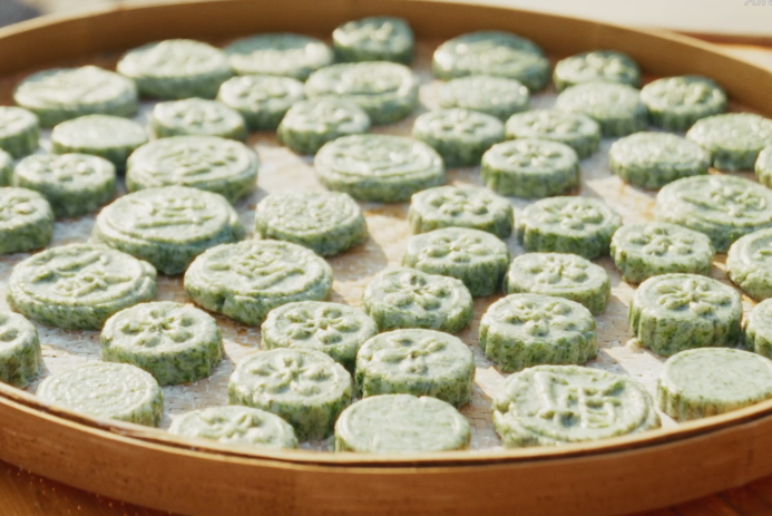 鼠曲糍又称清明粿,是福建清明时节的传统小吃。山间采回的鼠曲草配上提前泡好的糯米,经过煮制、捶打、蒸制、混合等工序,做成青绿色的粿团,再用模具轻轻拓印上“福”字和吉祥花纹。一枚枚软糯清香的鼠曲糍把时令、民俗与春意都揉进了这一口熟悉的味道里。