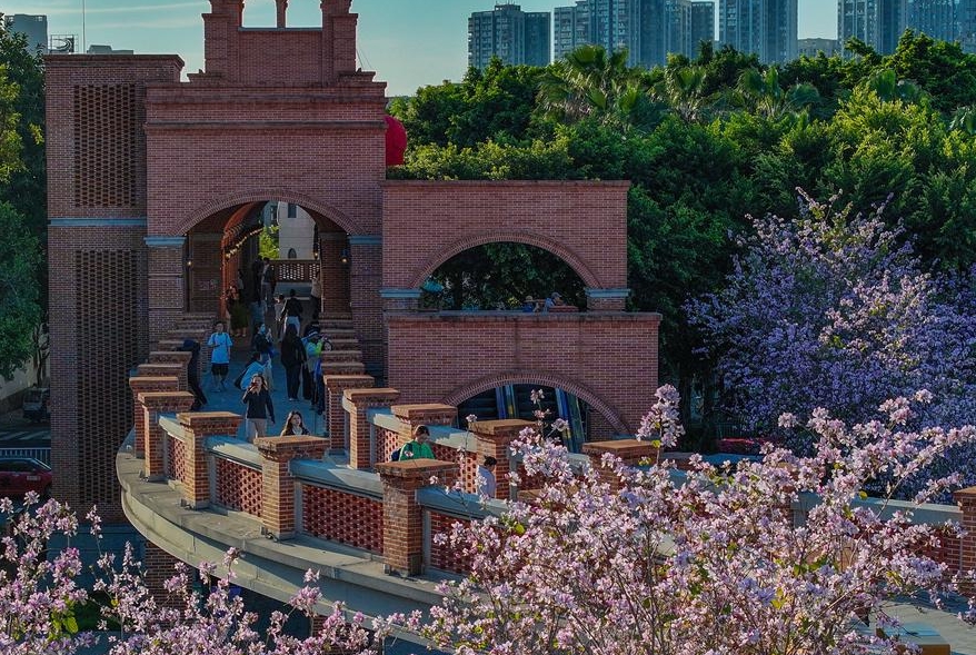 值得一提的是,青年桥与羊蹄甲织就了一道“相互成就”的美景。青年桥被誉为“福州最美天桥”,通过红砖塔楼、柱廊、窗花等设计元素,凸显闽都风韵,缤纷绚烂的羊蹄甲则代表着明艳的春日风情。当一座红砖风情桥在缤纷花影中“穿过”,桥显花姿,花彰桥韵。
