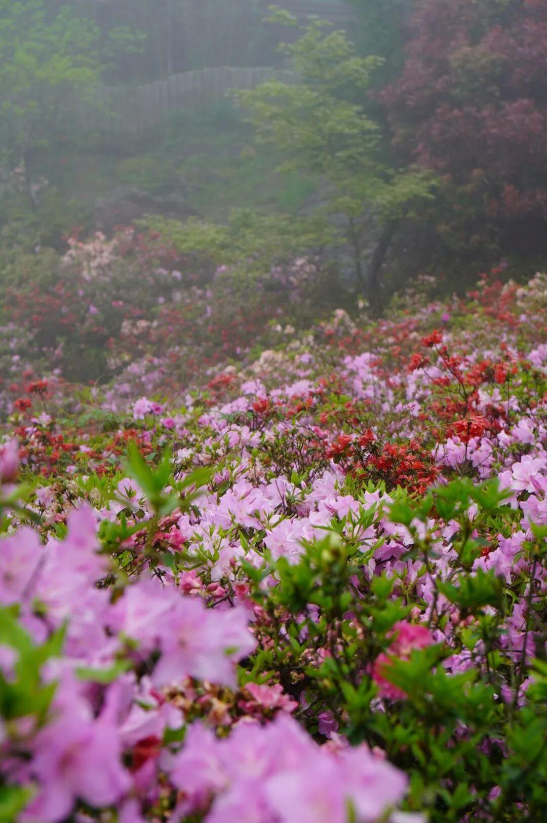 雨雾滋润中的杜鹃,配合着远山近峦的云雾缭绕,更是增添了一丝仙气。如果天气刚好,还能邂逅“春日奇观”云海,惊喜翻倍。