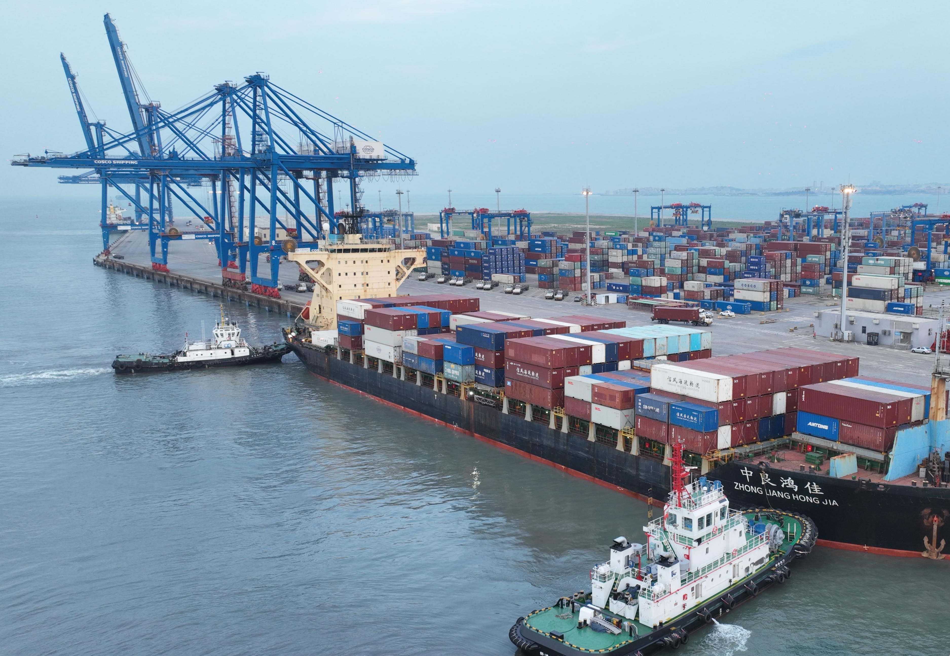 在泉州港石湖港区,一艘外贸集装箱船舶到港。(泉州晚报社融媒体记者林劲峰 摄)