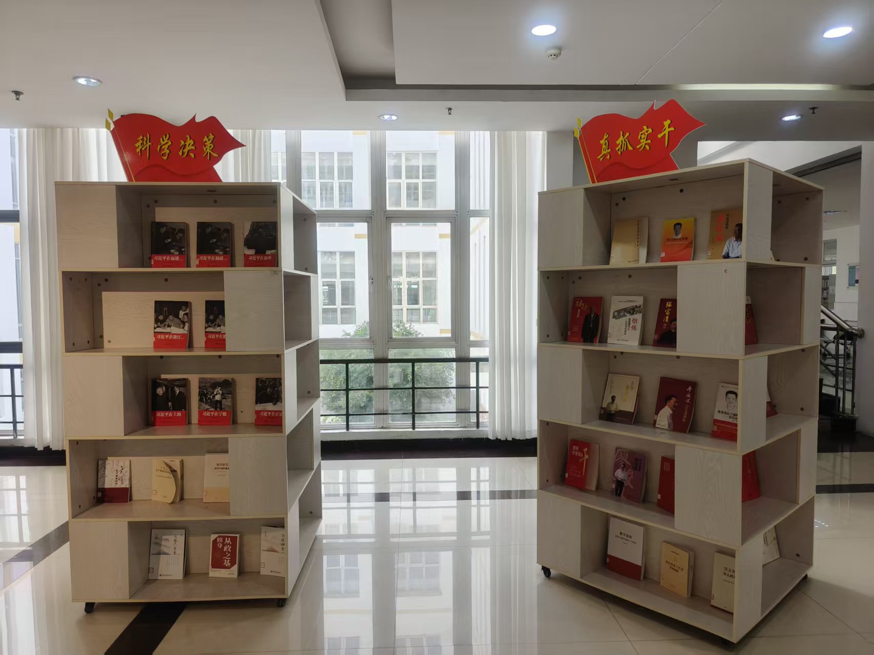“立党为公”专区聚焦党的初心使命,集中陈列《习近平谈治国理政》等权威著作及正确政绩观专题解读文献,阐释执政为民的根本宗旨,筑牢理想信念根基;“为民造福”专区以民生实践为主线,收录《习近平的七年知青岁月》《榜样之光》等纪实专著,搭配基层服务、群众工作相关案例读物,展现扎根基层、服务群众的为民情怀;“科学决策”专区精选《习近平在福建》《习近平在浙江》《习近平在正定》等系列著作,解读科学谋划、精准施策的治理智慧;“真抓实干”专区聚焦担当作为,展出《功勋》《廖俊波》等先进典型读物,弘扬求真务实、攻坚克难的奋斗精神。