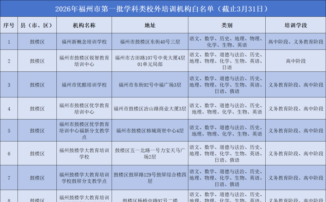 为深入贯彻落实国家“双减”政策,进一步规范校外培训机构办学行为,根据福州市校外培训机构整治工作联席会议办公室关于印发《福州市校外培训机构黑白名单管理制度》的通知(榕教规〔2024〕4号),经审核认定,截至2026年3月31日,全市列入白名单的学科类校培机构共155家(包括分支机构),非学科类校培机构共252家。在此特别提醒各位家长,为孩子选择培训服务时,应该要认准证照齐全、合规经营的正规机构。