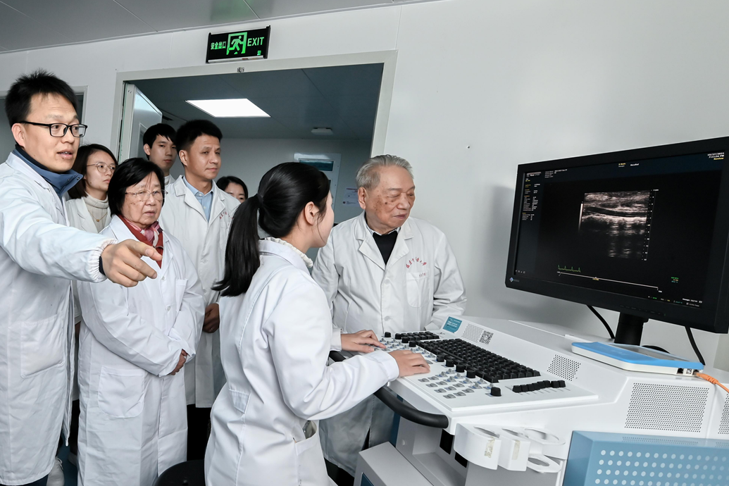 团队学姐带着不同专业新人利用小动物超声检测小鼠血管、心脏功能。郑琳琳 摄