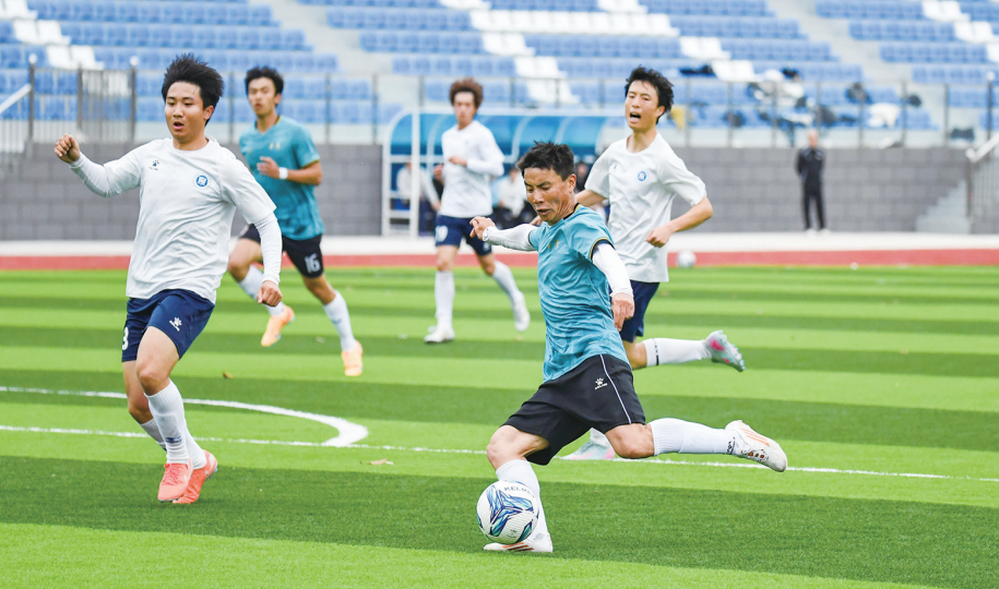 平潭队(蓝色队服)与福建技术师范学院足球队(白色队服)开展比赛。