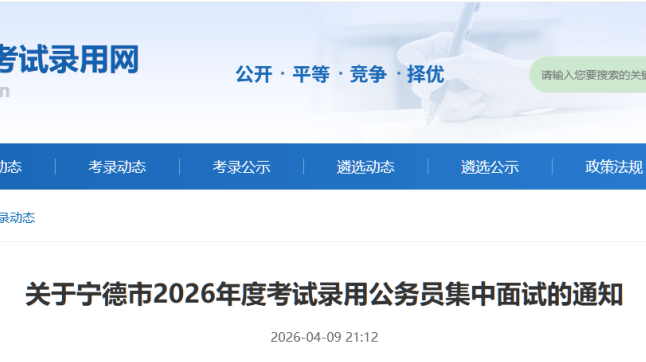 根据《福建省2026年度考试录用公务员公告》及相关工作要求,宁德市2026年度考试录用公务员面试工作将于2026年4月11日至4月14日进行。为确保广大考生顺利应考,现将有关事项通知如下:
