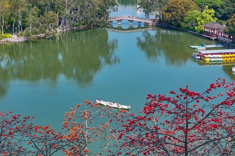 福州西湖畔成片木棉花开,船行湖上仿佛画中游。记者 包华 摄