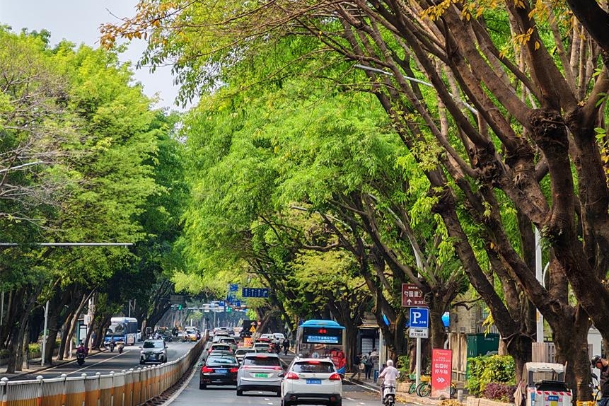白马北路一路通向湖滨路,道路两侧的行道树枝繁叶茂。当一阵春风吹过,榕树摇曳着它的枝丫,泛黄的树叶在空中飞舞。马路上、花圃里、人行道上,一片片落地的树叶犹如为马路铺上了一层“黄金甲”。行人踩在那一层“黄金甲”上,树叶沙沙作响。眼前的这番美景,构成了一幅迷人的“秋日画卷”。
