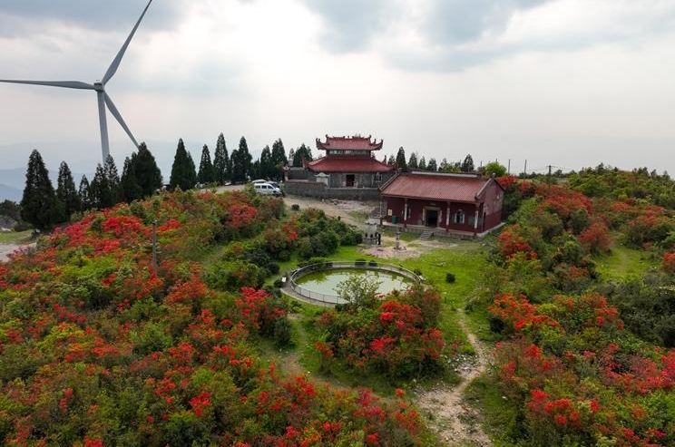 这片花海以野生古树杜鹃为主,高海拔低温环境让花期相对延后,每年4月中旬至5月上旬为最佳观赏期。作为闽清县首个风电项目,大湖仙风电场将绿色能源与自然景致巧妙融合,成为福州近郊春日赏花的热门打卡地。(记者 池远 摄)
