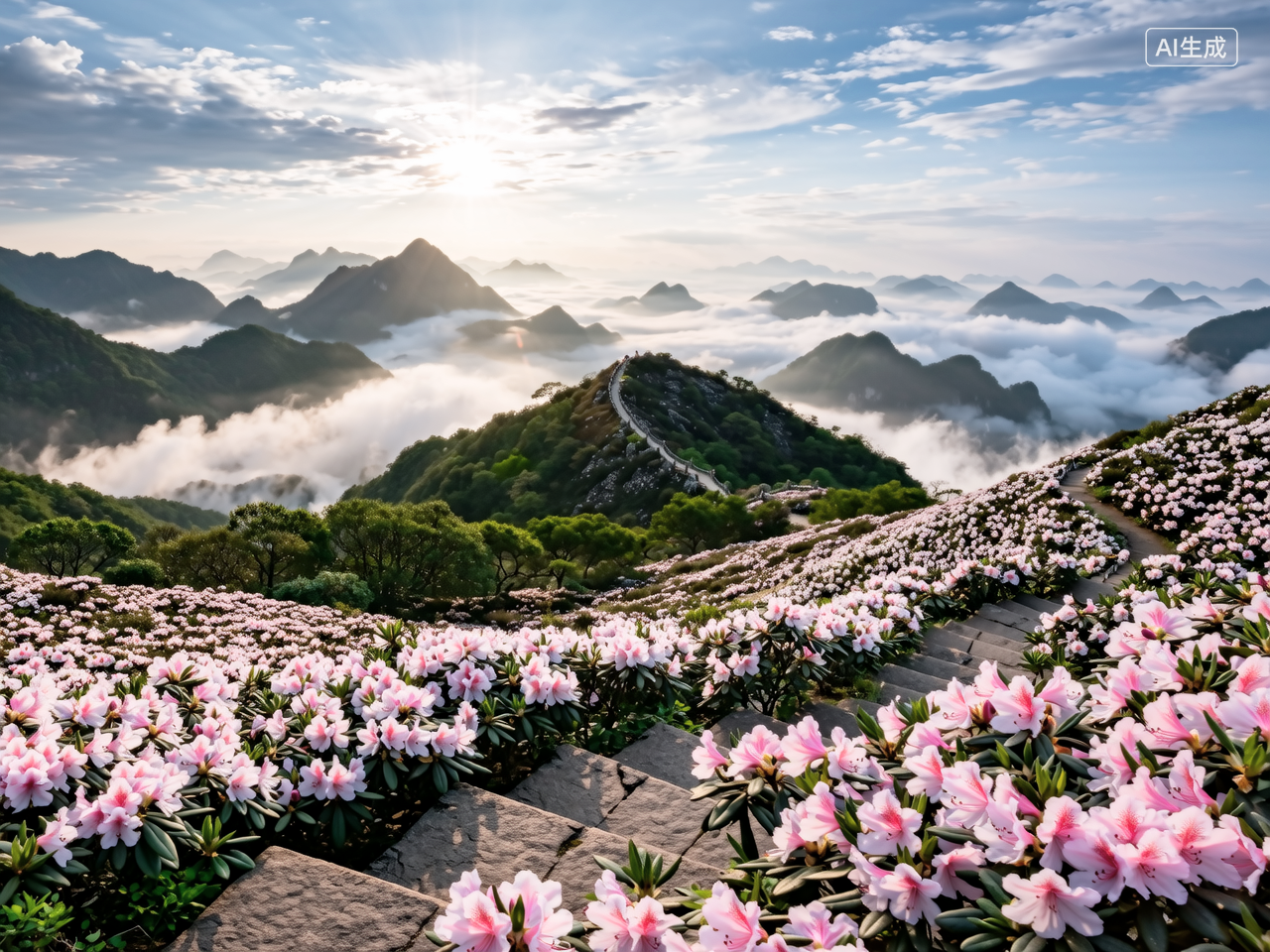 近来,位于千米山巅的闽清大湖仙风电场迎来野生杜鹃盛花期。