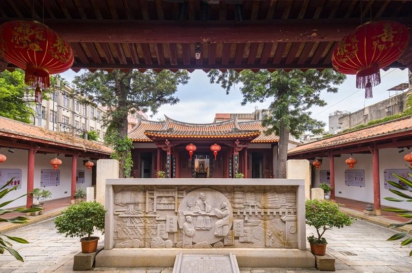 石井书院内院,对称布局的闽南古建与朱子主题石雕相映。陈钧摄