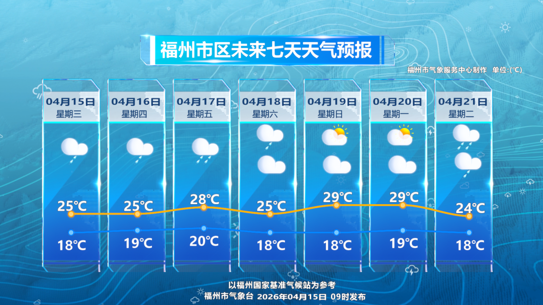 15日到19日,福州市多阵雨或雷阵雨,雷雨时局地伴有短时强降水、7~10级雷暴大风或冰雹等强对流天气,其中降水相对明显的时段为15日和17日。