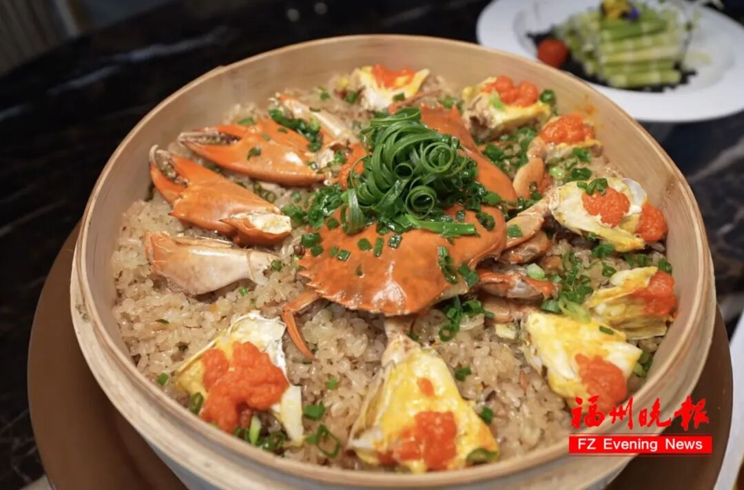 近日,记者来到位于三坊七巷的福州文儒九号,见证了这道非遗美食的诞生过程。后厨里,厨师长赵嘉程手脚麻利、动作娴熟,蒸糯米、切配菜、大锅翻炒八宝饭,一系列操作行云流水;待红蟳处理妥当,他将其整齐摆放在八宝饭上,盖上蟹壳,经10至12分钟蒸制后,撒上翠绿葱花、浇上少许热油,一道色泽浸润、油光分明的琅岐红蟳八宝饭便出炉了。