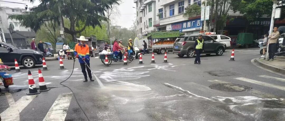 了解到该情况,县住建局迅速调配8名环卫工人、1台高压洗路车赶赴现场,第一时间设置警示标识,同步协调公安部门实施临时交通管控,开展现场交通疏导。随后,环卫工人按照规范流程对路面油污进行覆盖吸附、反复清扫与高压冲洗,至当天上午10时40分,该路段路面全面清洗完毕,恢复正常通行。
