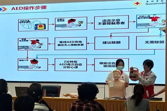 下午的课程更侧重实用技能提升。在国际高端旅游接待礼仪与外语实用口语环节,讲师围绕仪容仪表、跨文化沟通以及文旅场景常用外语表达等方面进行教学,推动服务向国际化、高品质升级。现场应急救护知识培训则干货满满,讲师通过理论讲解与实景操作,详细示范了心肺复苏(CPR)、AED使用、止血包扎、骨折固定等技能,让学员在亲身体验中掌握突发情况的处置方法,切实提升了应急救援能力。