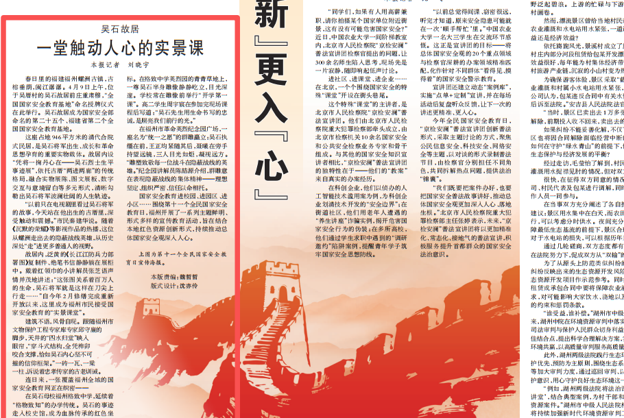 4月16日,人民日报法治版刊发报道《国家安全宣传教育 出“新”更入“心”》。在第十一个全民国家安全教育日,各地开展形式多样的特色主题活动,福州市推动吴石故居授牌全国国家安全教育基地,持续推动总体国家安全观深入人心。