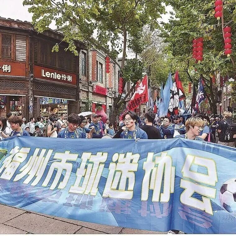大赛在即,福州市球迷协会组织的“闽超”助威巡游从烟台山码头乘船沿江而下,徒步经过上下杭历史文化街区,又来到了三坊七巷。