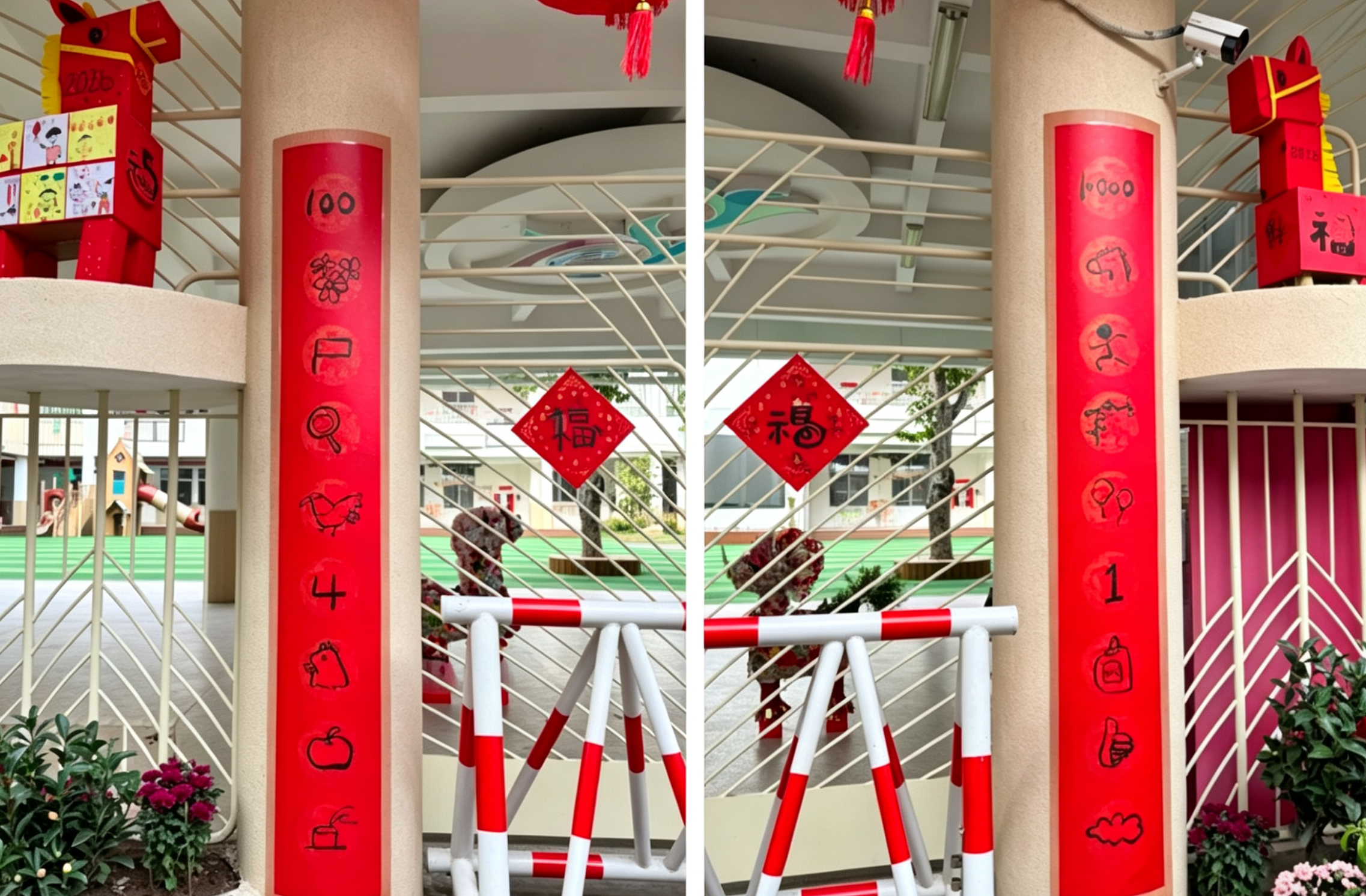 古老的智慧延续传承,泉州孩子们也将充满童趣的创意融入对联中。不久前,泉州市实验幼儿园的小朋友们创作的一副春联受到央广网、央视网、光明网等33家媒体的关注,并在社交平台上刷屏。这副对联由手绘图案和阿拉伯数字构成,据该幼儿园的蔡老师介绍:“上联的意思是‘万马奔腾期一年好运’,下联的意思则是‘百花齐放迎四季平安’。孩子们的理解跟我们成年人不一样,他们用‘气球’的‘气’的谐音‘期’来表达的‘期待’的意思,于是在对联上画了气球,表示期待一年好运。‘百花齐放’是则分别以阿拉伯数字100,花朵、旗帜、放大镜的图案来表示。孩子们用符号、图案代替文字,既直观又富有想象力。”