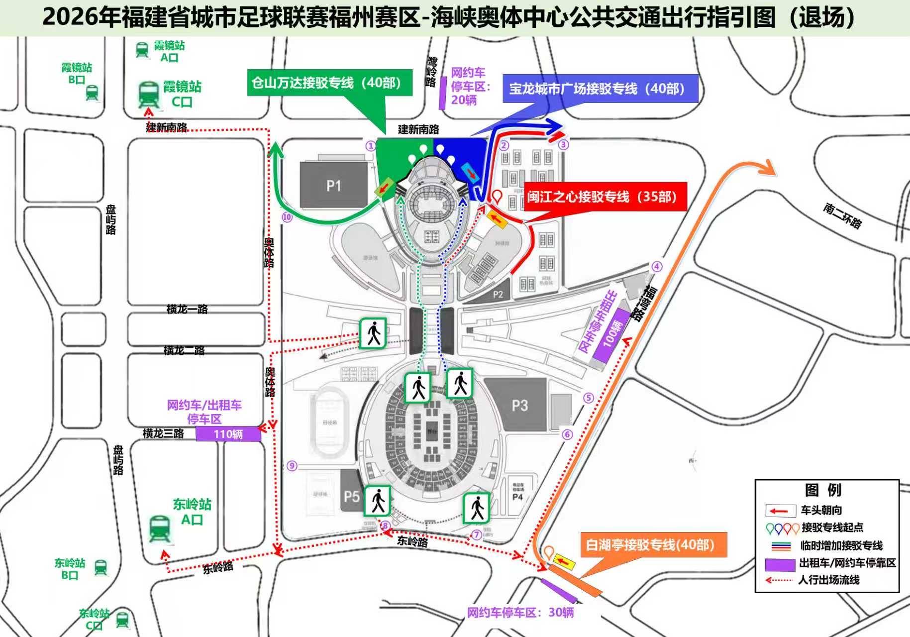 2.观众可由海峡奥体中心西广场离场,根据引导标识向南步行约700米至东岭地铁站A口,或向北步行约900米至霞镜地铁站C口。