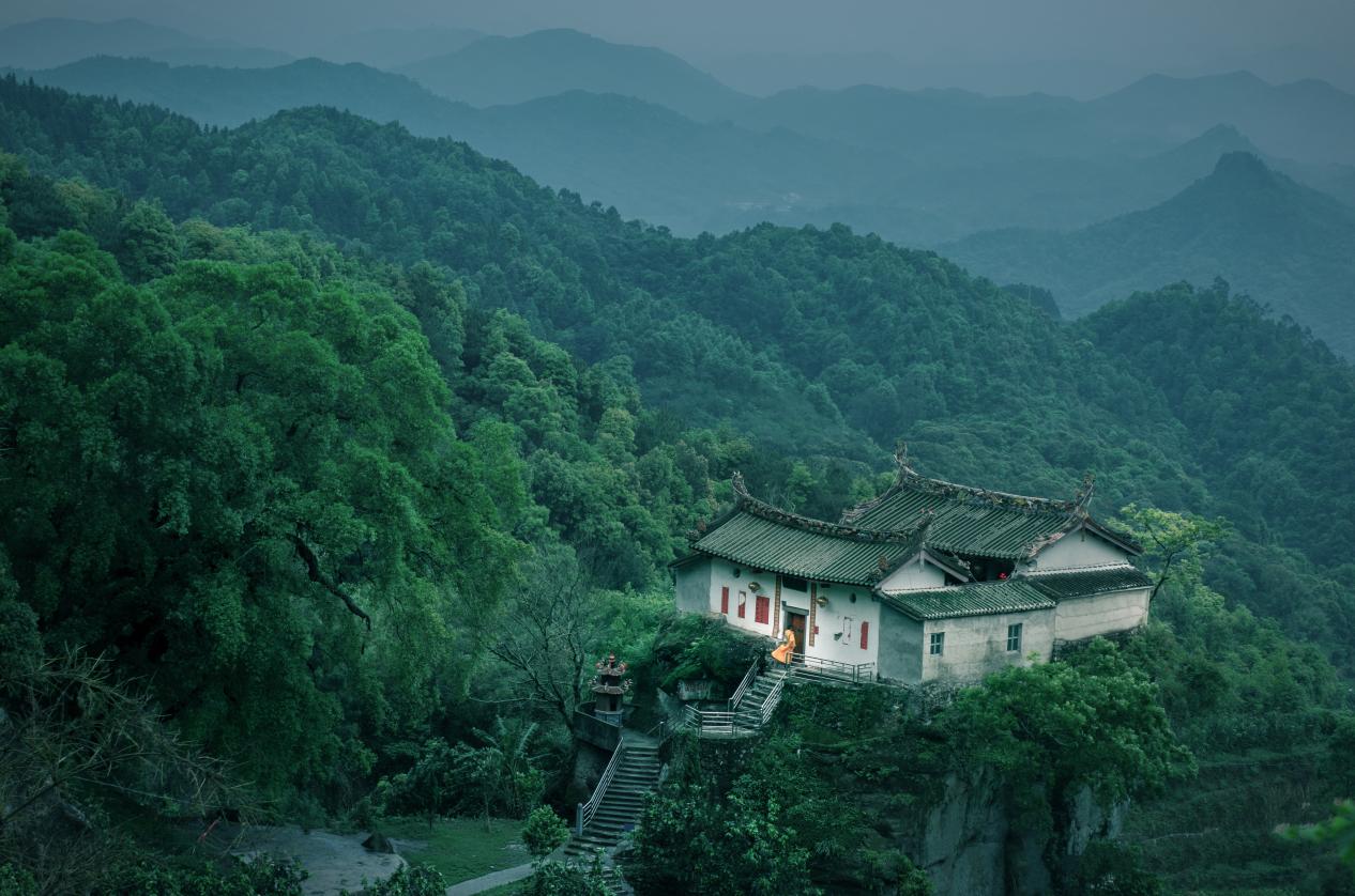 这座位于大溪镇石寨村的朝天寺,始建于宋代建隆三年(公元962年),迄今已有千年的悠久历史。寺庙坐落于大峰山南麓一块巨石之巅,整座建筑巍然屹立在冲天崖颠,远远望去犹如一只昂首张口的巨蟒,地势之奇、视觉之险令人叹为观止。登上古寺,站在崖颠俯瞰,周围峰峦叠嶂、深谷清泉尽收眼底,极具“小黄山”的险峻韵味。