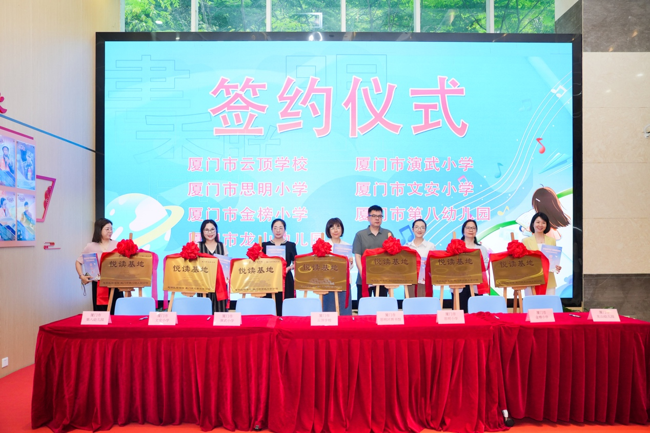 现场,思明区图书馆与7所学校、幼儿园正式签署共建分馆(流通点)协议书,并颁发“悦读基地”牌匾。这7所学校分别是:云顶学校、第八幼儿园、龙山幼儿园、思明小学、演武小学、金榜小学、文安小学。
