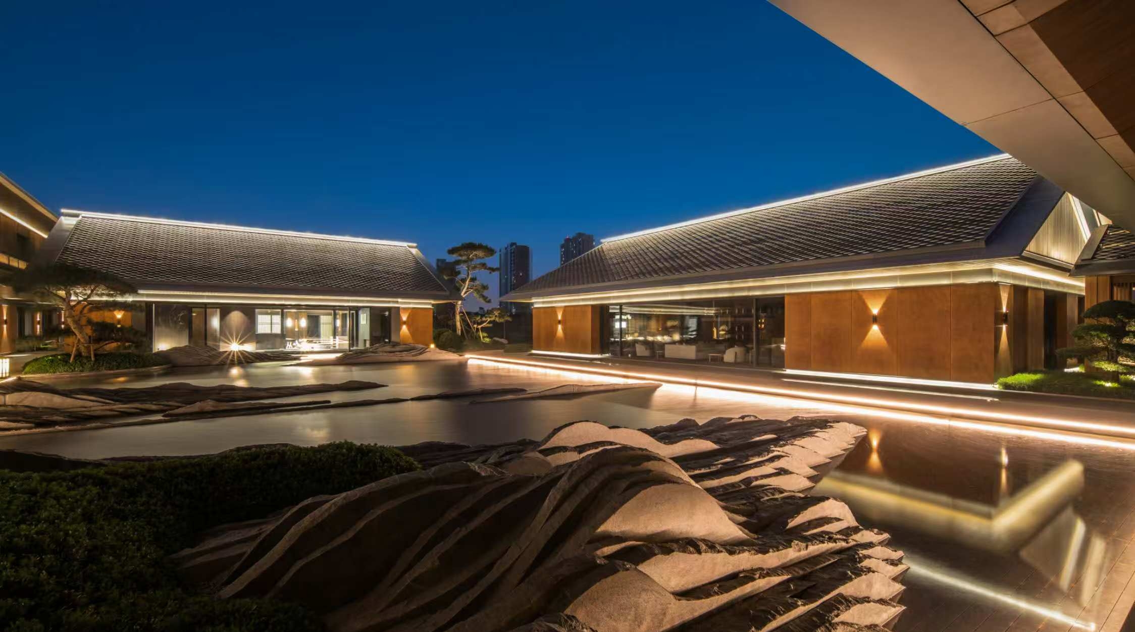 浅池如镜,将天光、屋影、树姿尽数收纳,微风拂过,水面泛起细碎涟漪,连带着池边堆叠的景观石,都像是从远山搬来的缩影,寥寥几笔,就勾勒出“虽由人作,宛自天开”的禅意。