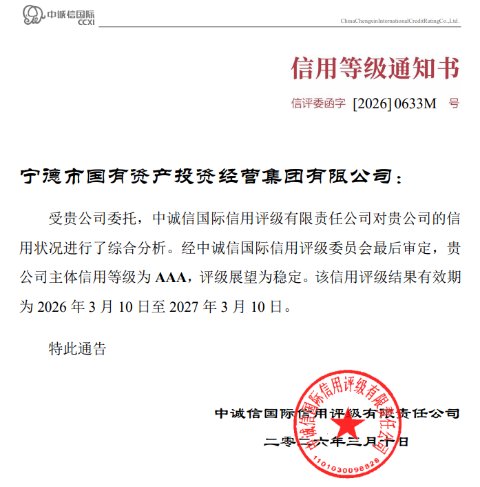 ——宁德市国投集团信用建设再获突破,获评中诚信国际主体长期信用等级AAA,成为全市首家拥有两家权威评级机构AAA等级的国有企业。双AAA信用评级为企业拓宽融资渠道、降低融资成本、服务地方发展注入强劲底气。