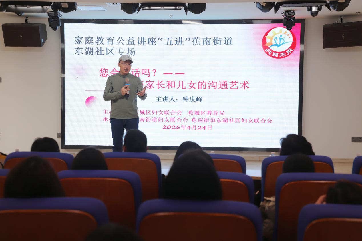 新福建新闻客户端4月25日讯 4月24日,一场生动实用的家庭教育公益讲座在宁德蕉南街道东湖社区举行。蕉城区教师进修学校校长钟庆峰以《您会说话吗?——例谈家长与孩子的沟通艺术》为题,为现场数十名社区家长带来了一场深入浅出的亲子沟通辅导课。